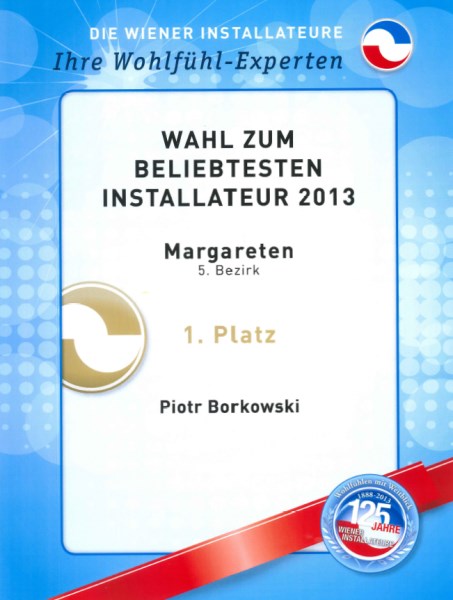 Im Mittelpunkt unserer Arbeit steht die Zufriedenheit unserer Kunden. Besonderes Augenmerk legen wir daher auf den persönlichen Kontakt und eine individuelle Beratung. Dadurch schaffen wir eine Vertrauensbasis als Grundlage für eine jahrelange Zusammenarbeit. Kunden schätzen neben unserer Produktkompetenz auch das Know-how unserer Mitarbeiter, die hohe Qualität unserer Arbeit, die flexiblen Lösungen und unser effizientes Zeitmanagement. Nicht umsonst wurden wir im Rahmen des Jubiläums „125 Jahre Wiener Installateure“ zum beliebtesten Installateur im 5. Wiener Gemeindebezirk gewählt.